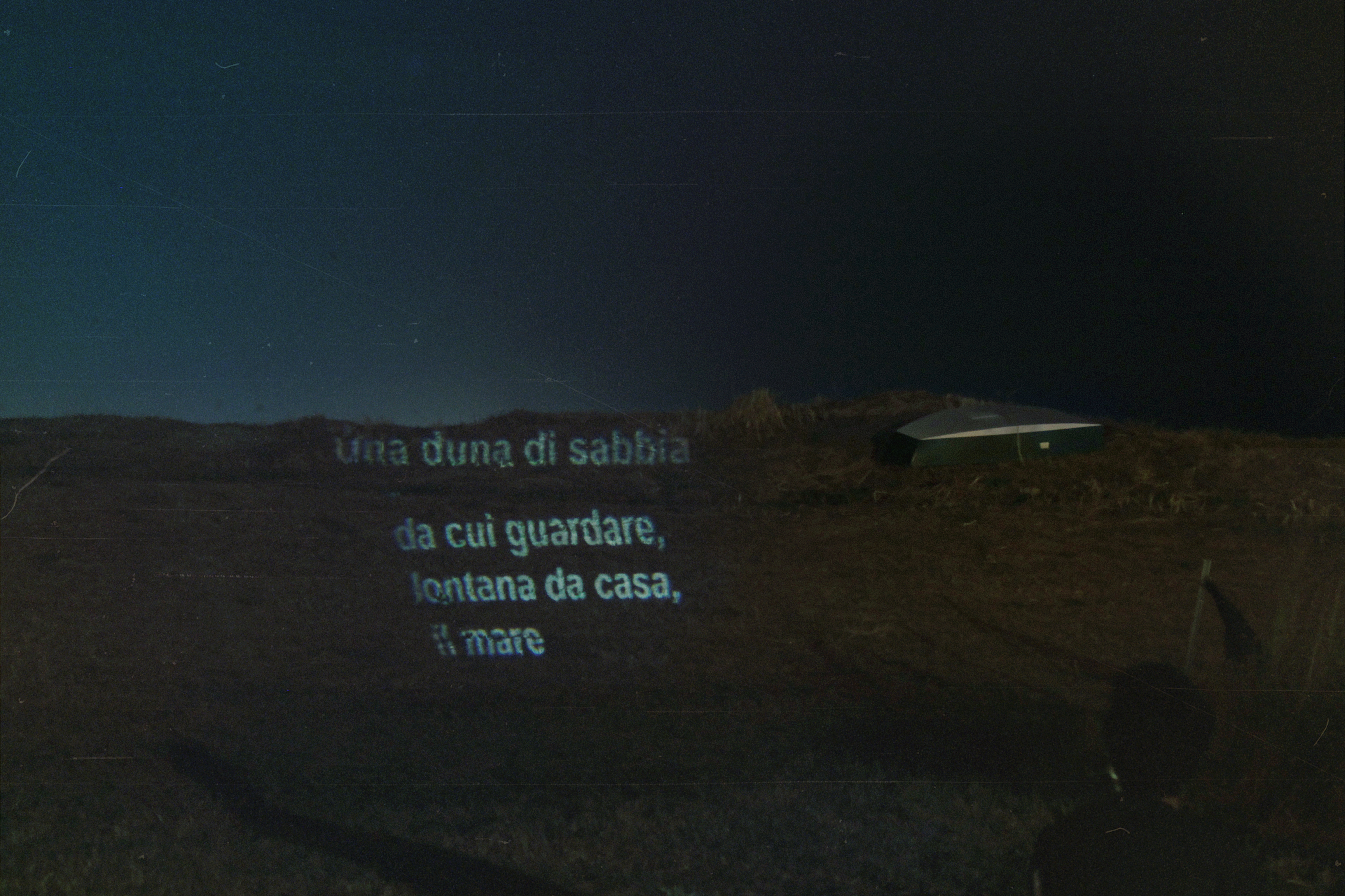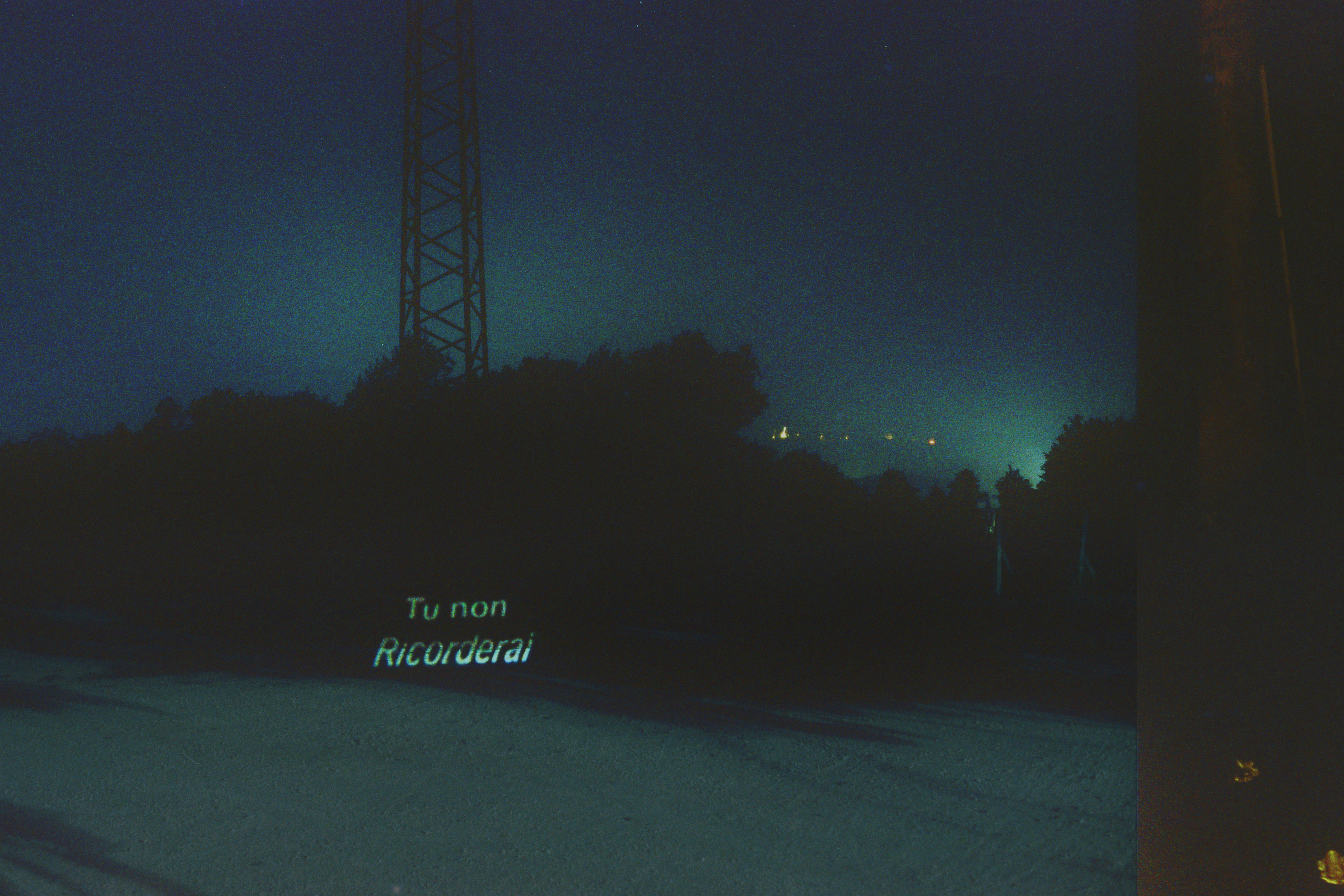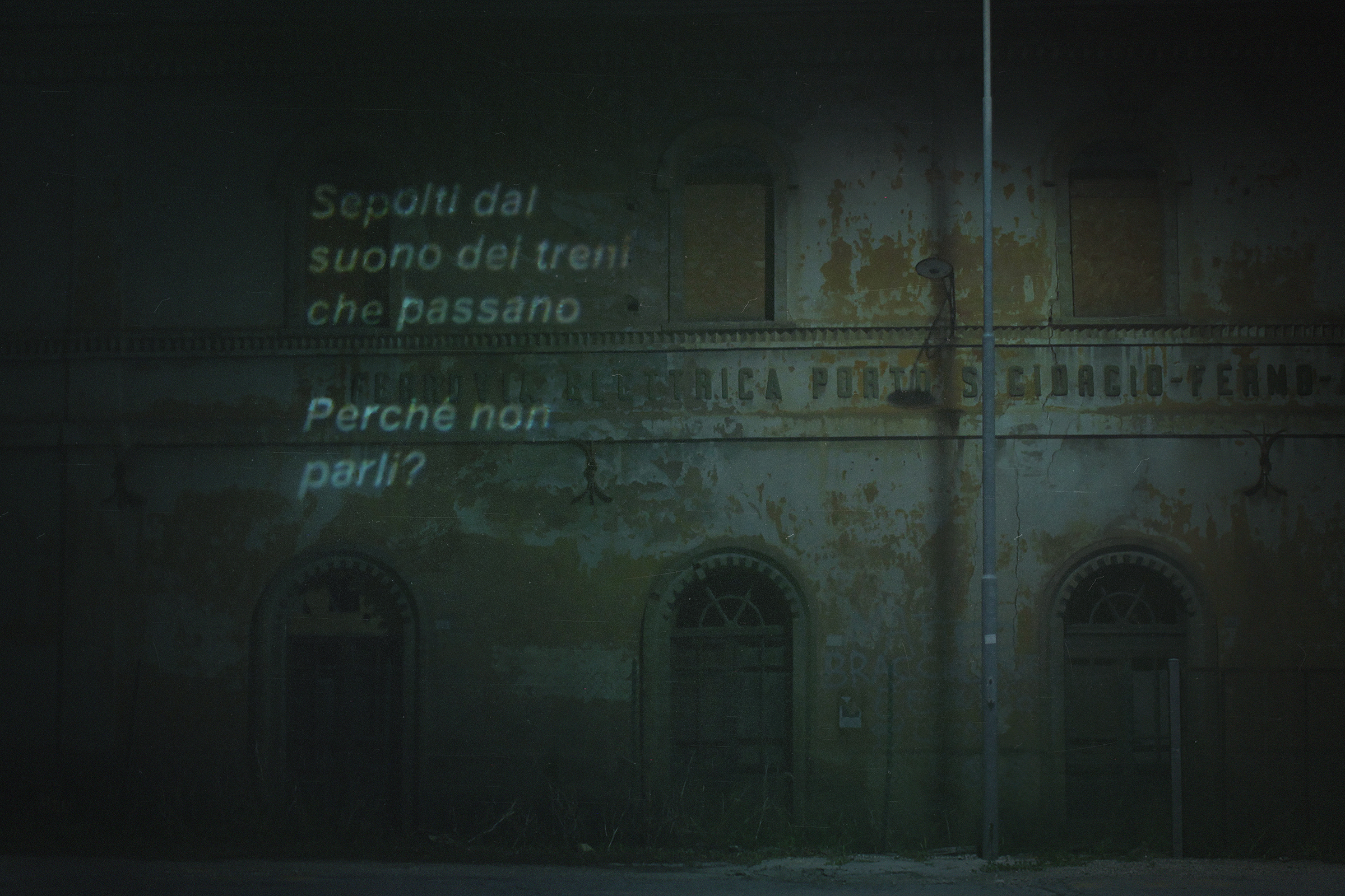 The work is performed through light projections, manifesting short original texts on the walls of places and buildings in suburban areas of different cities, all made during the summer of 2019. The photographs documenting the operation are then returned as slides reproduced in a specific order.