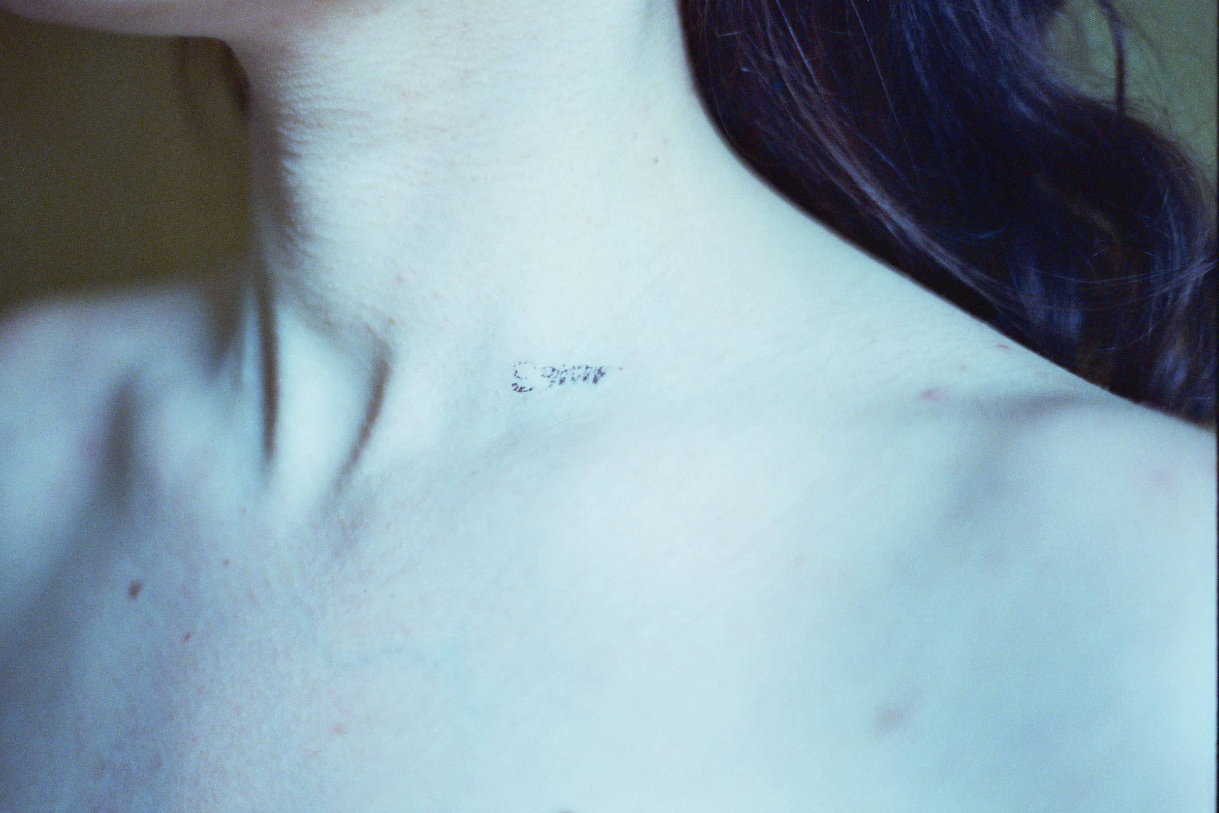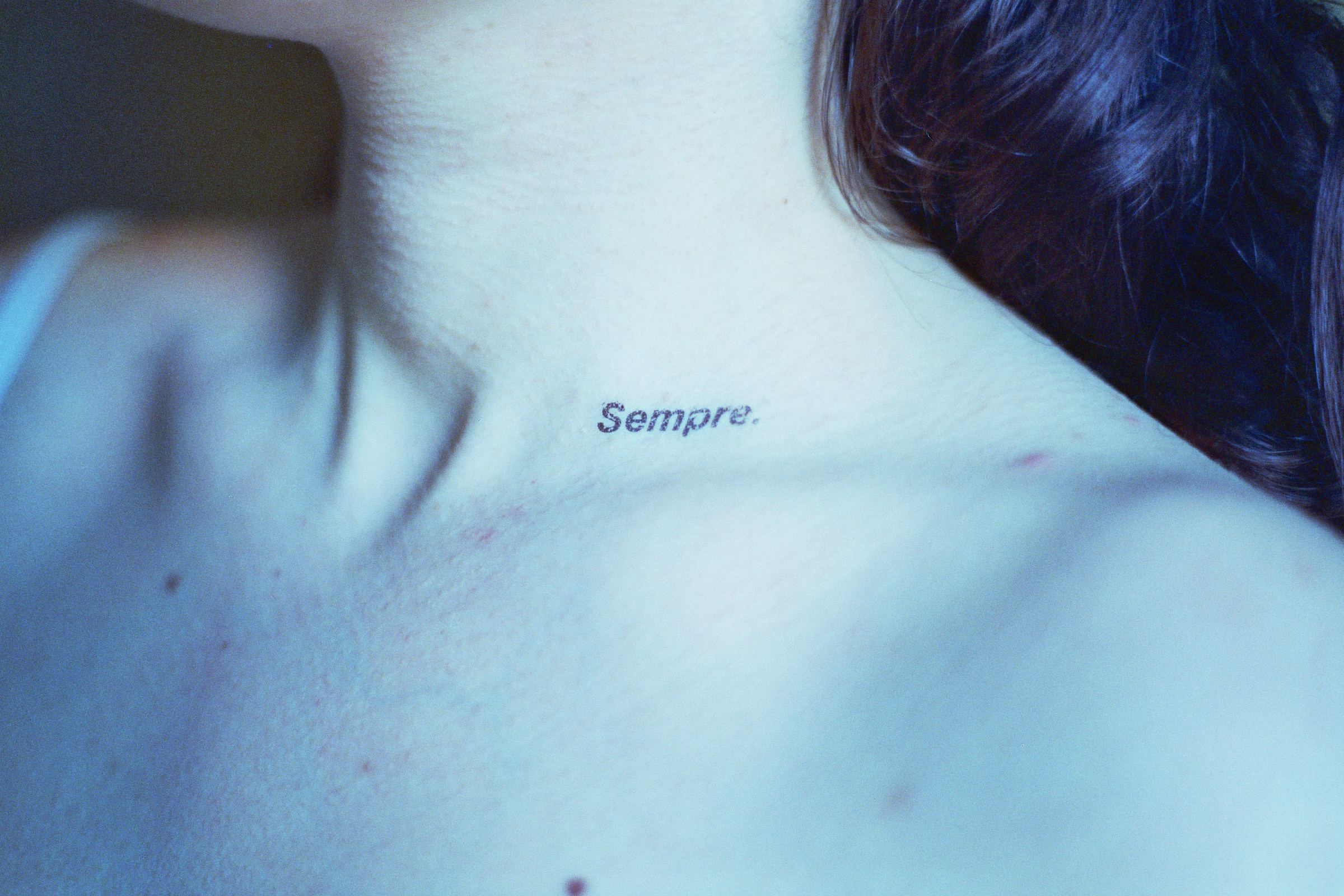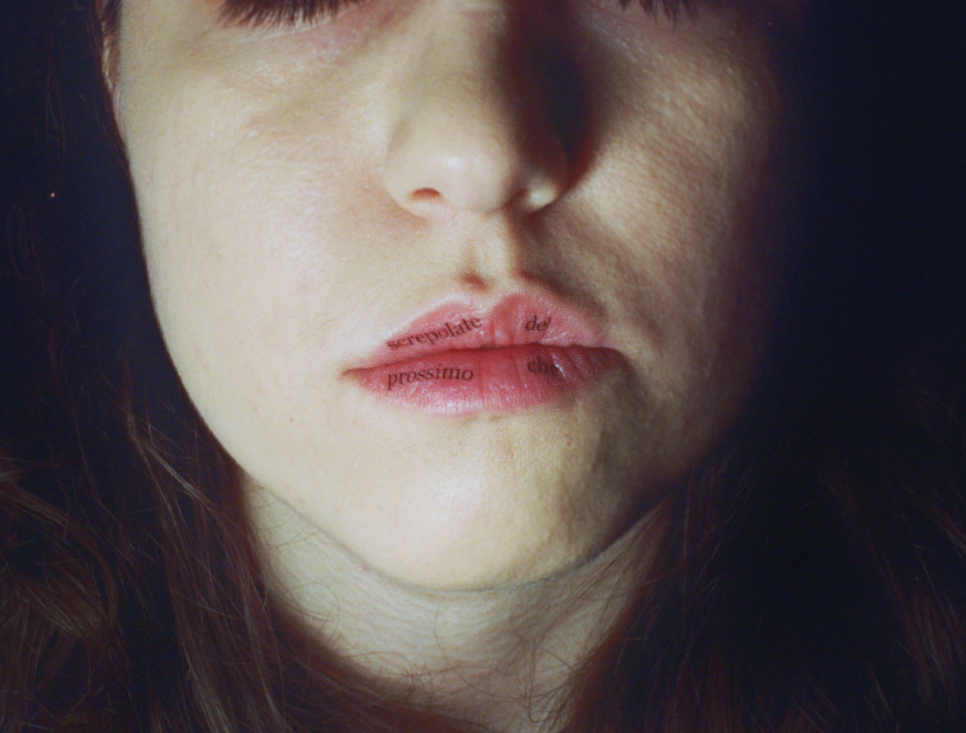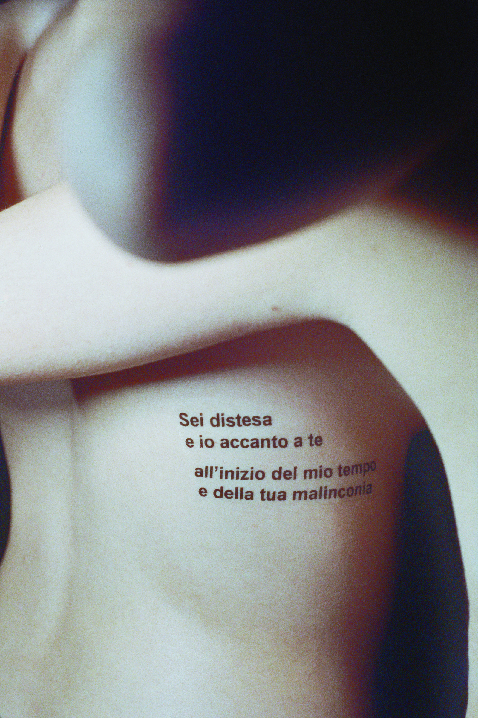This photographic series captures washable tattoos applied on the skin of the people portrayed, on specific body parts. The tattoos are made by the artist having as subject original texts.