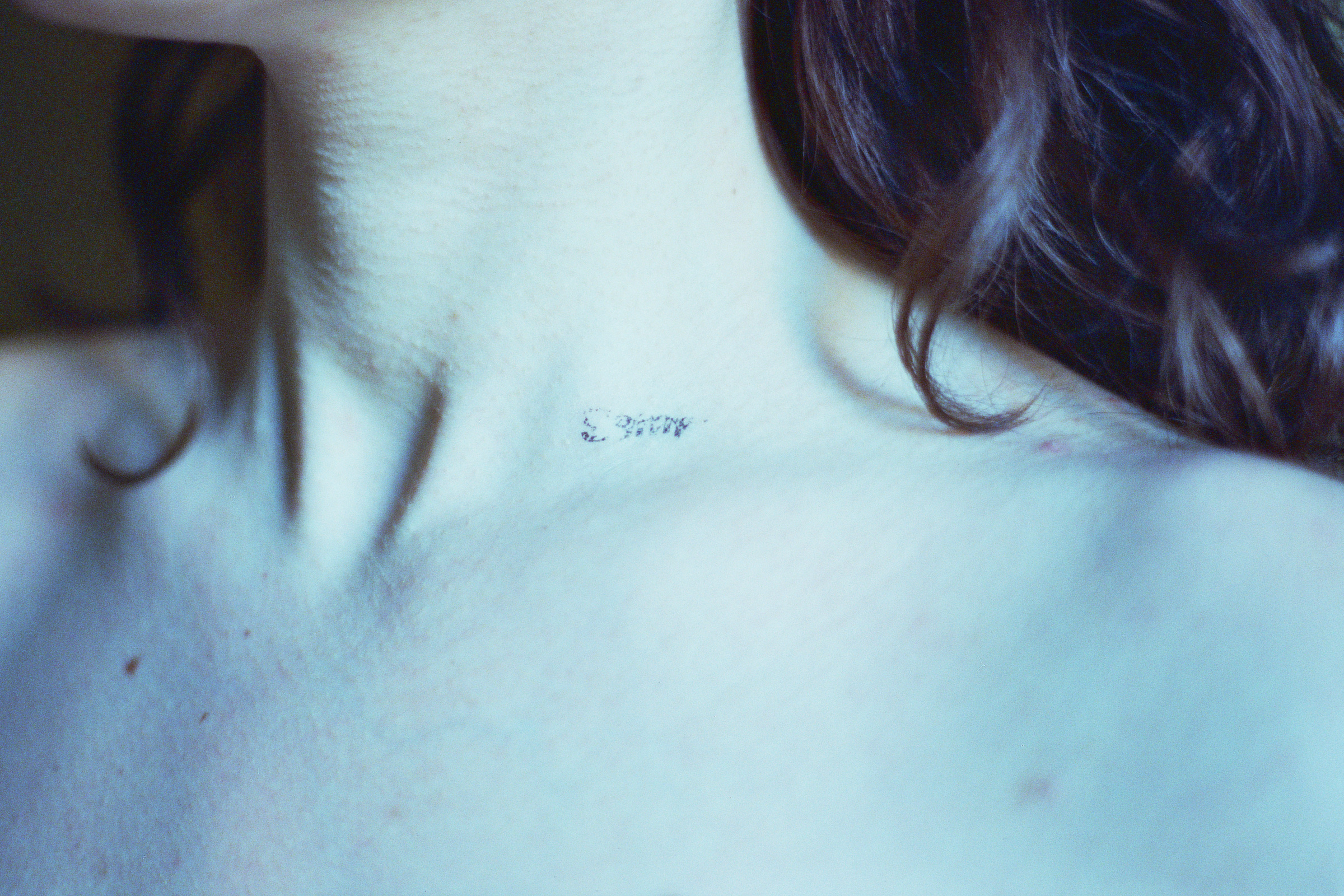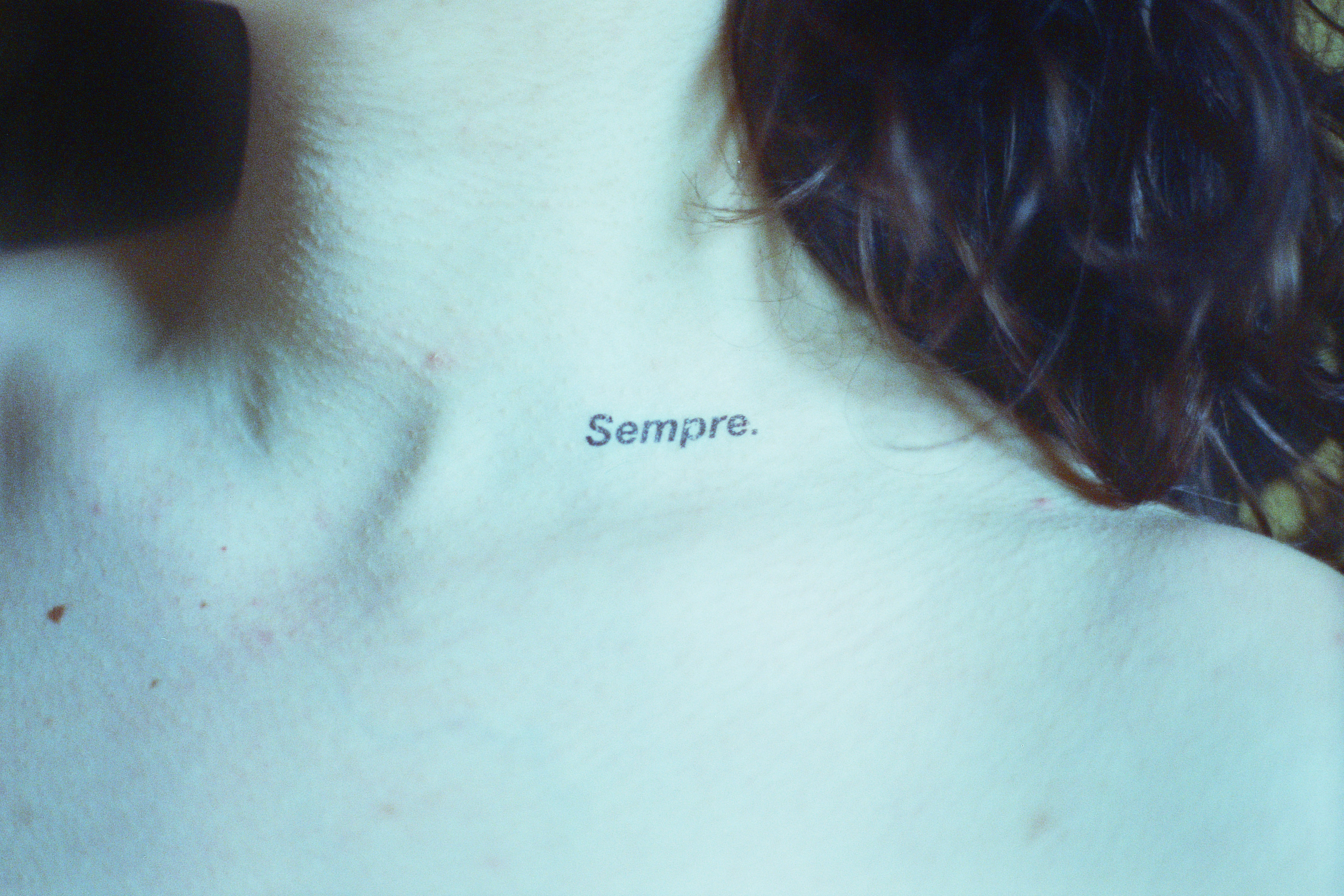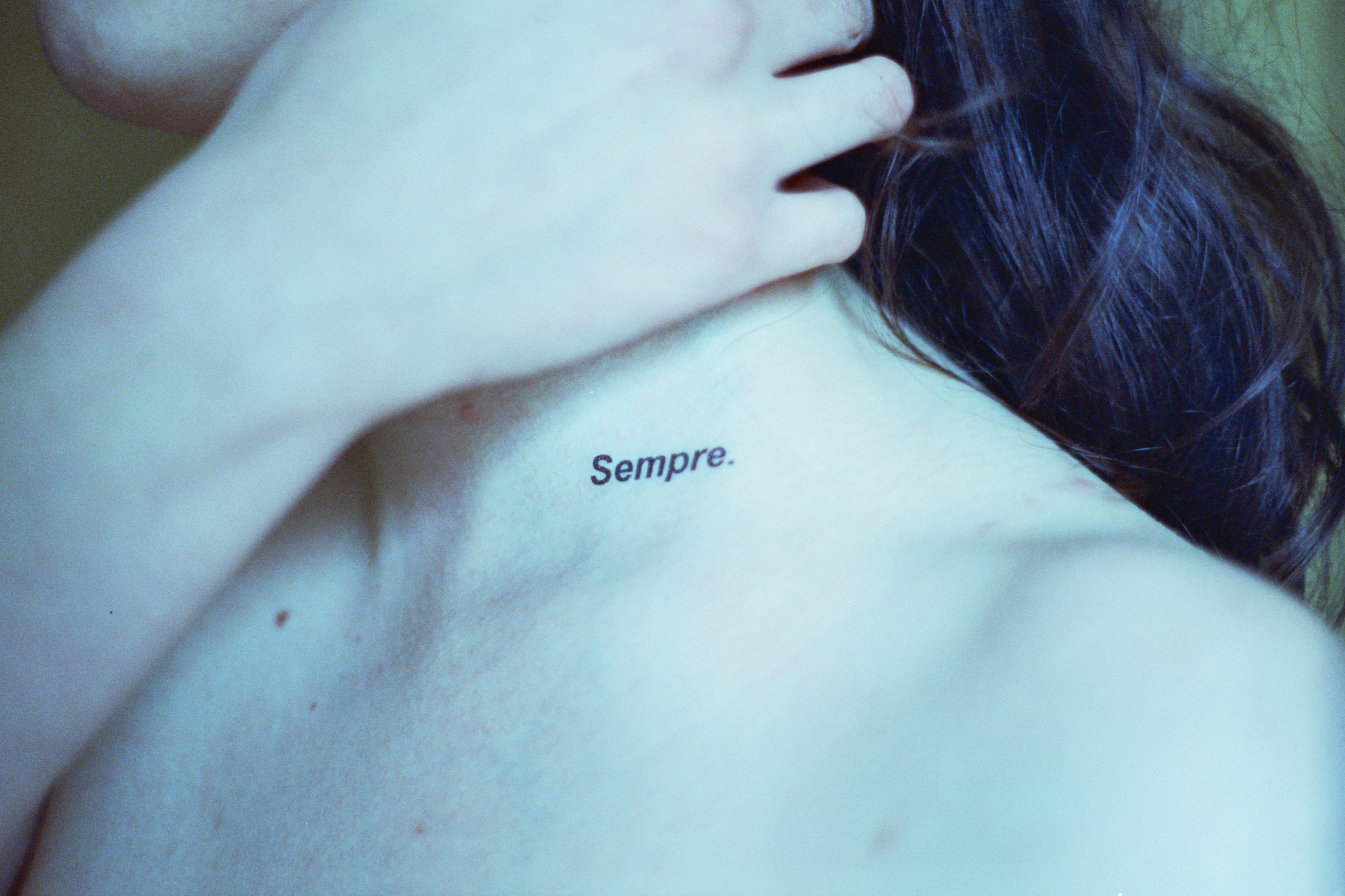 This photographic series captures washable tattoos applied on the skin of the people portrayed, on specific body parts. The tattoos are made by the artist having as subject original texts.