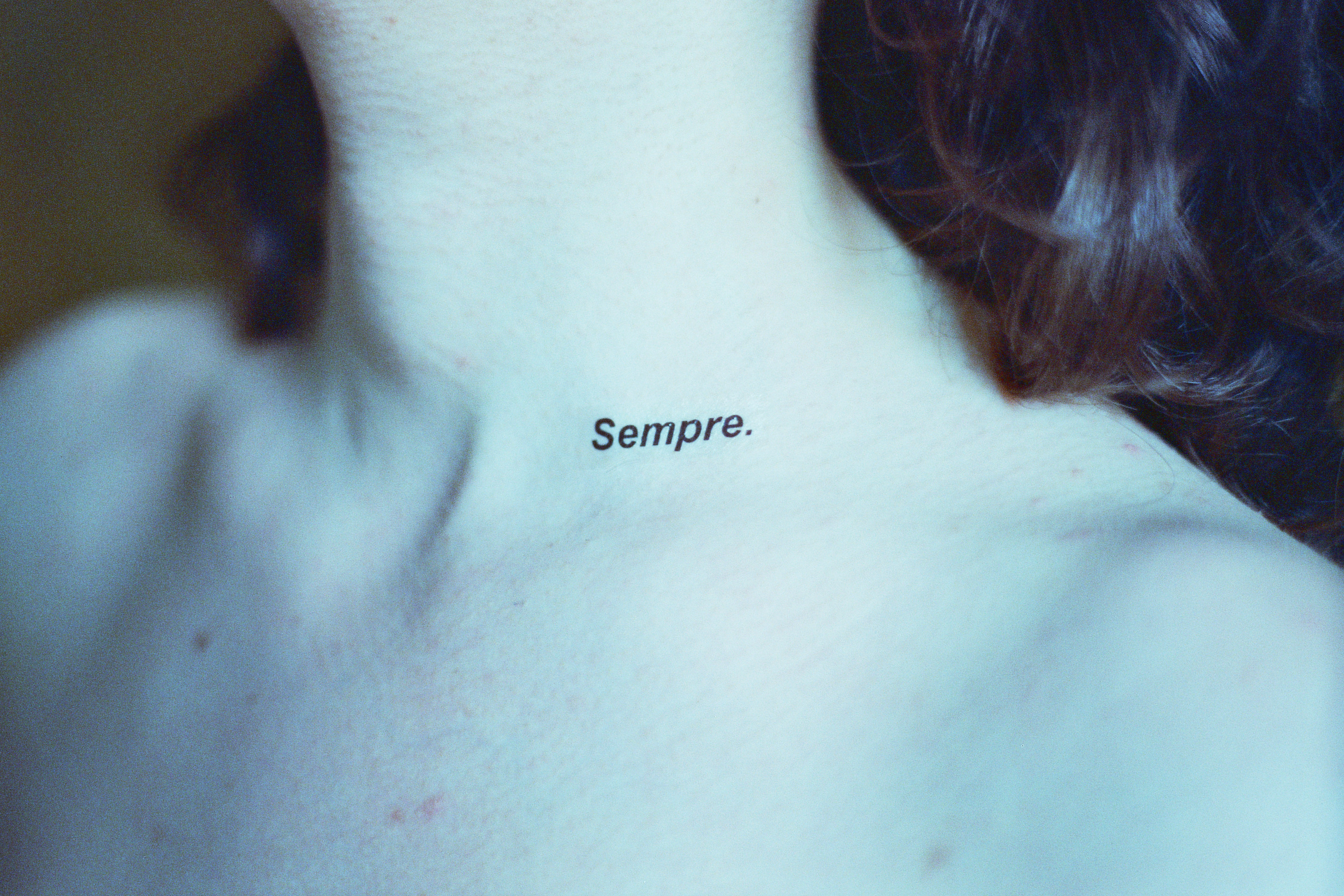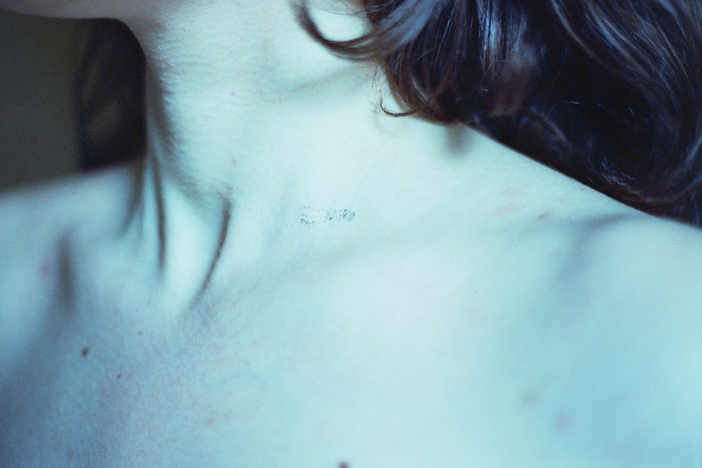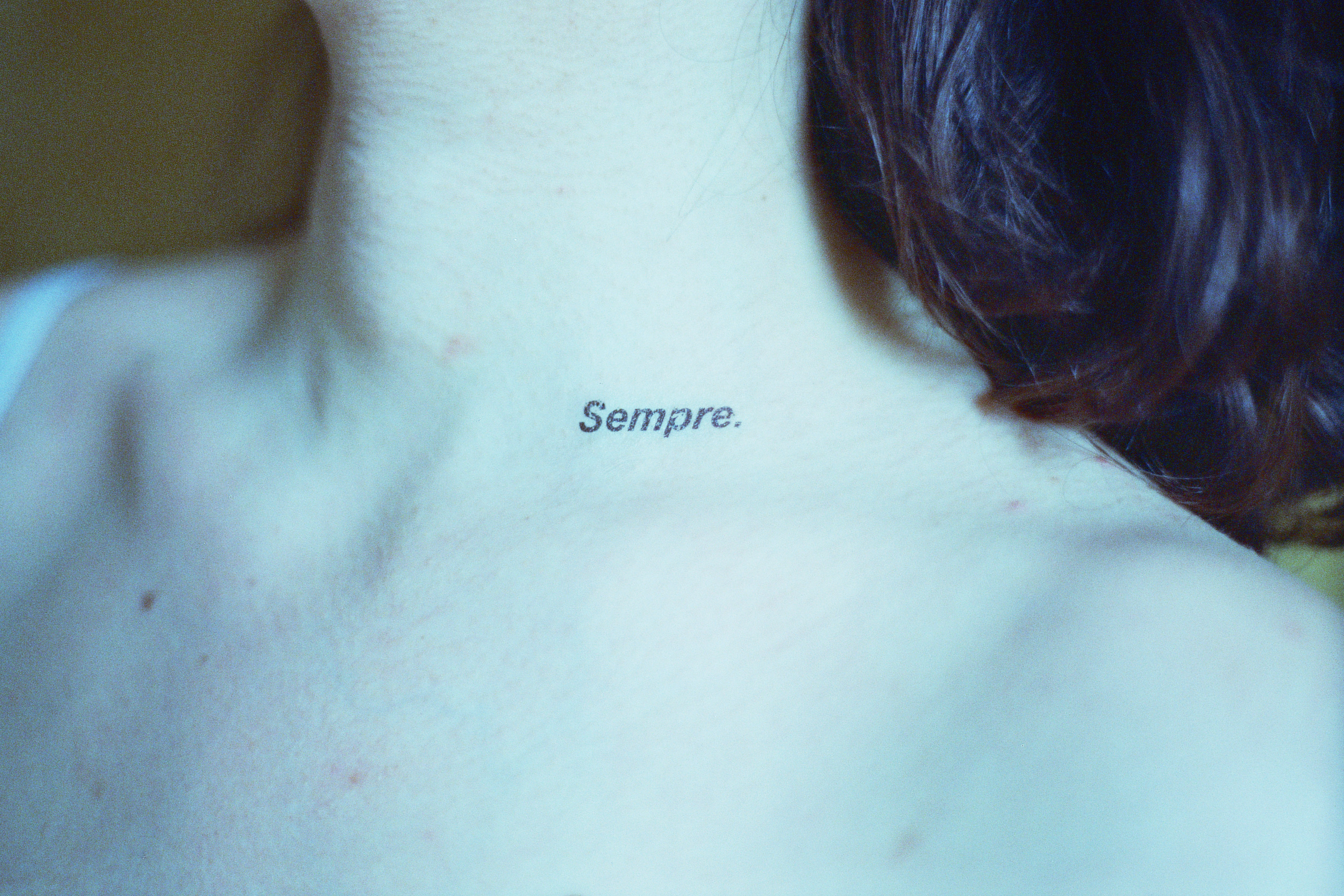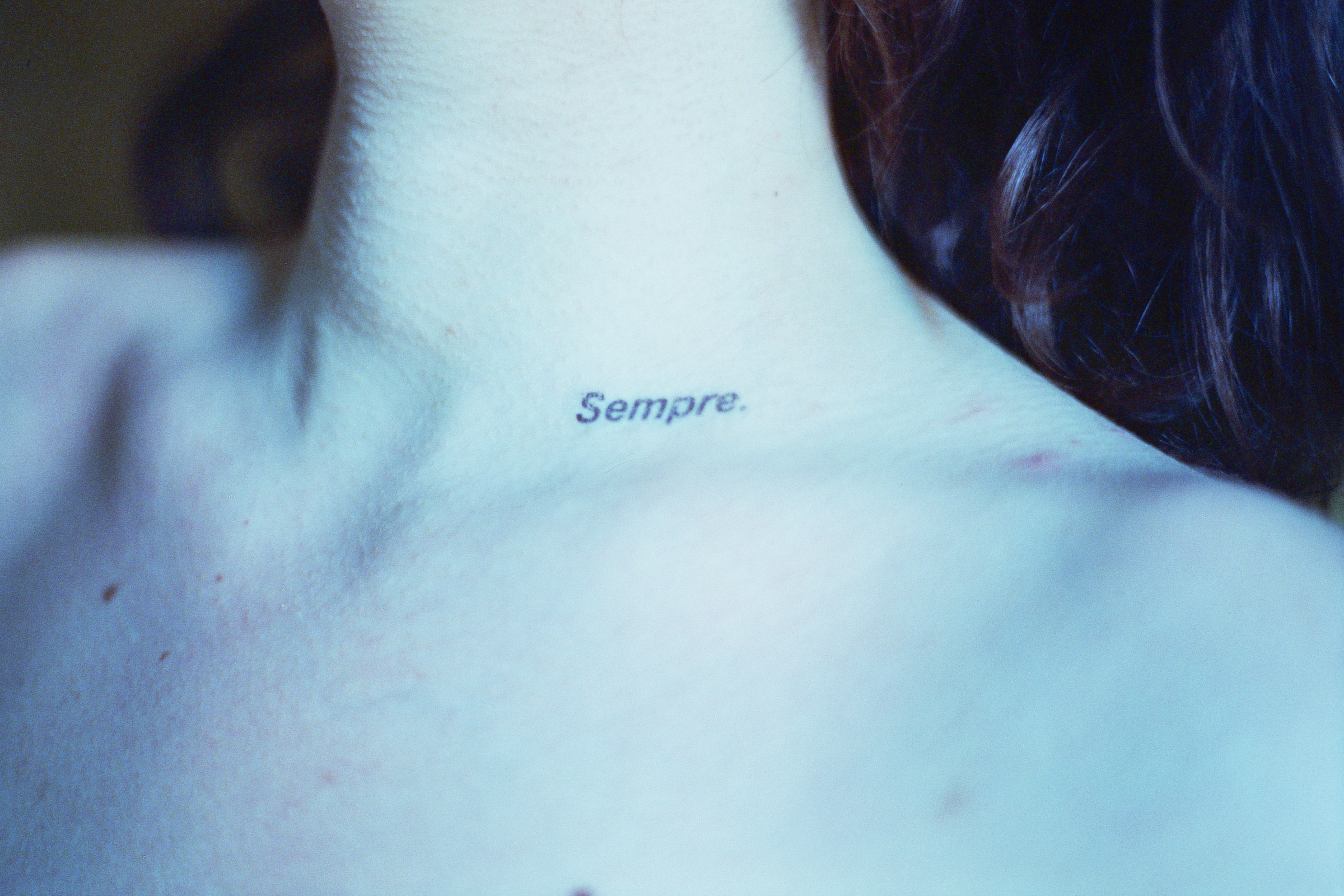 This photographic series captures washable tattoos applied on the skin of the people portrayed, on specific body parts. The tattoos are made by the artist having as subject original texts.